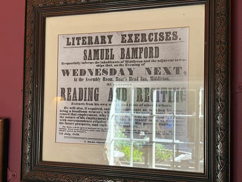 19th-century English writer and poet Sam Bamford is a notable name in Middleton and has a room named after him in the pub, with many of his works depicted there in his honour:
